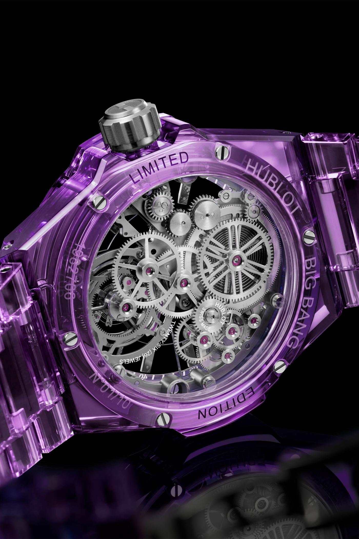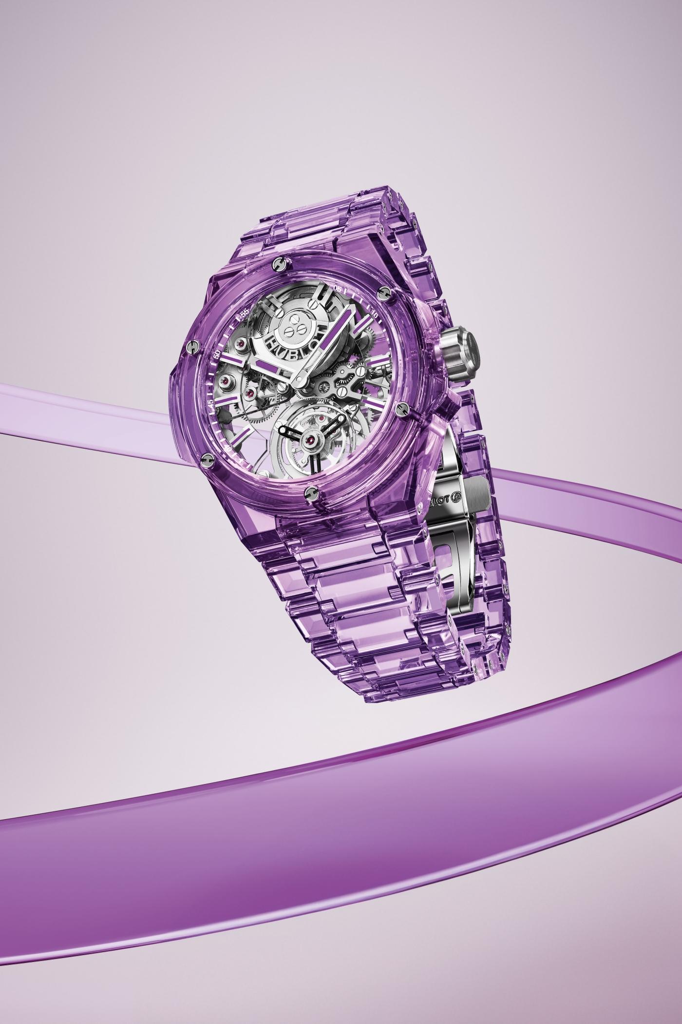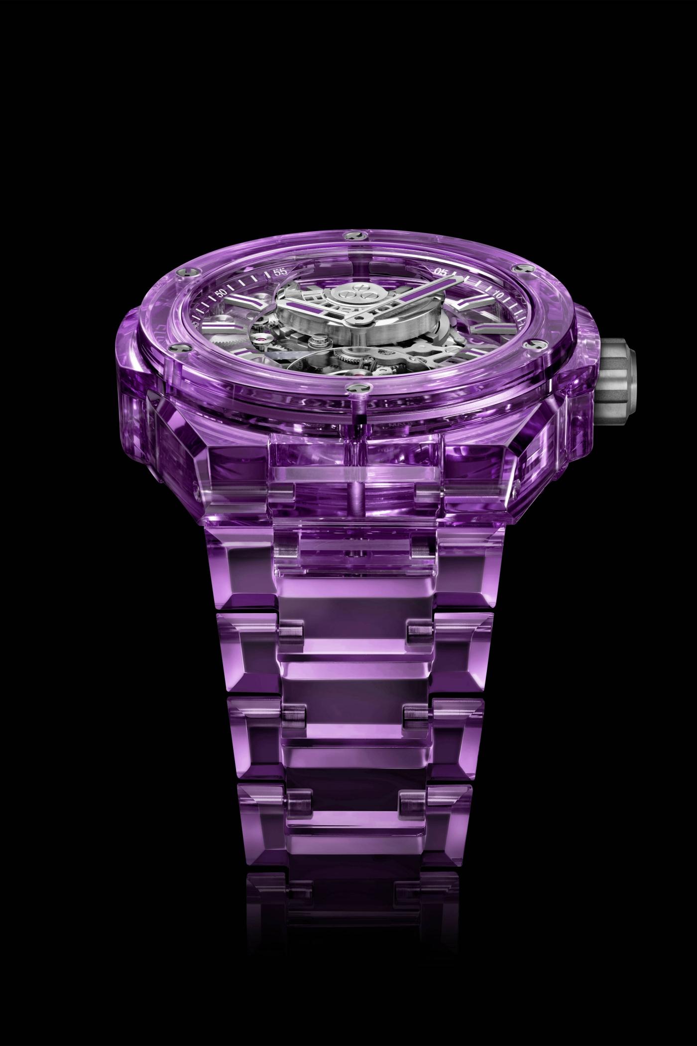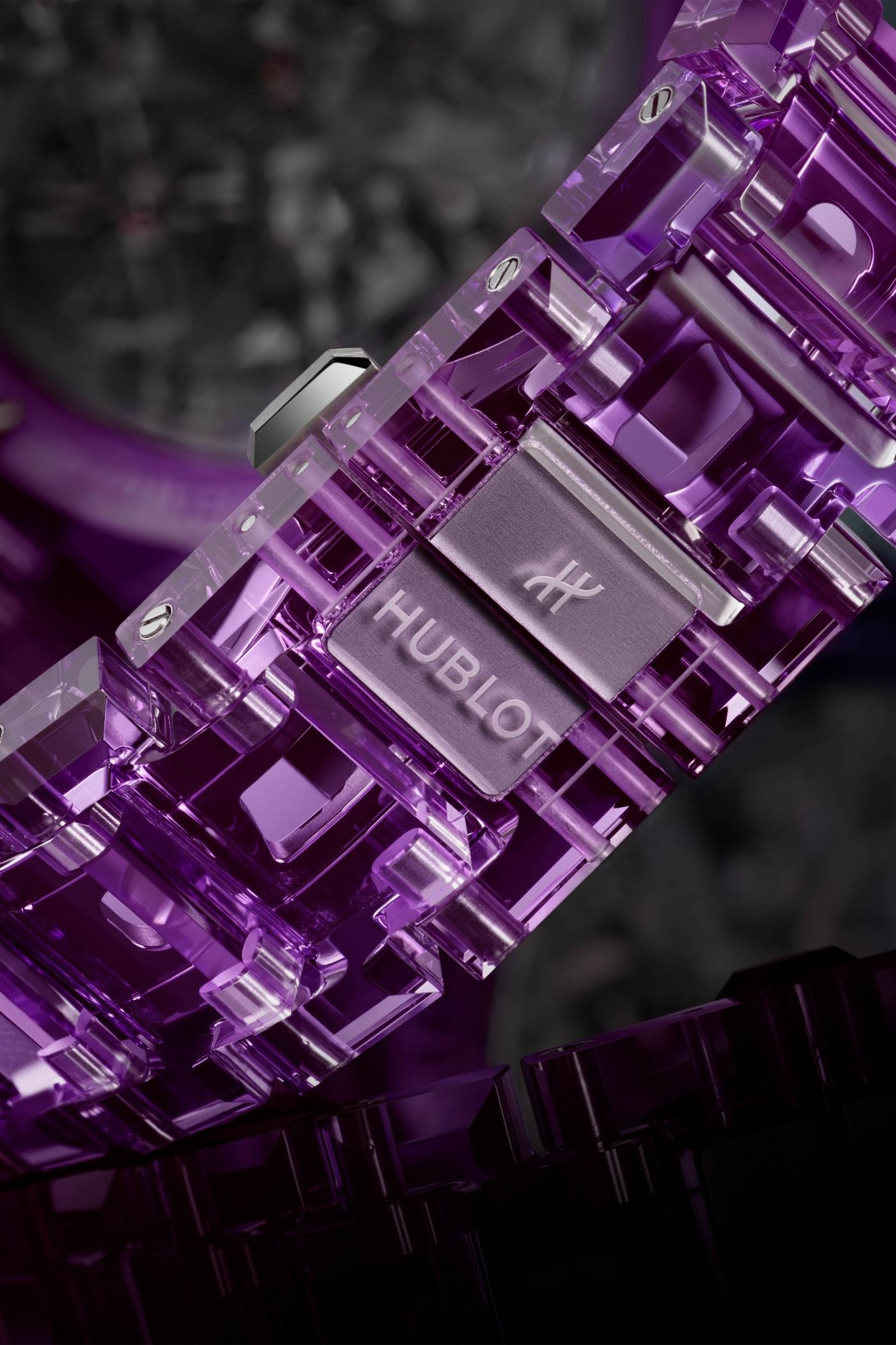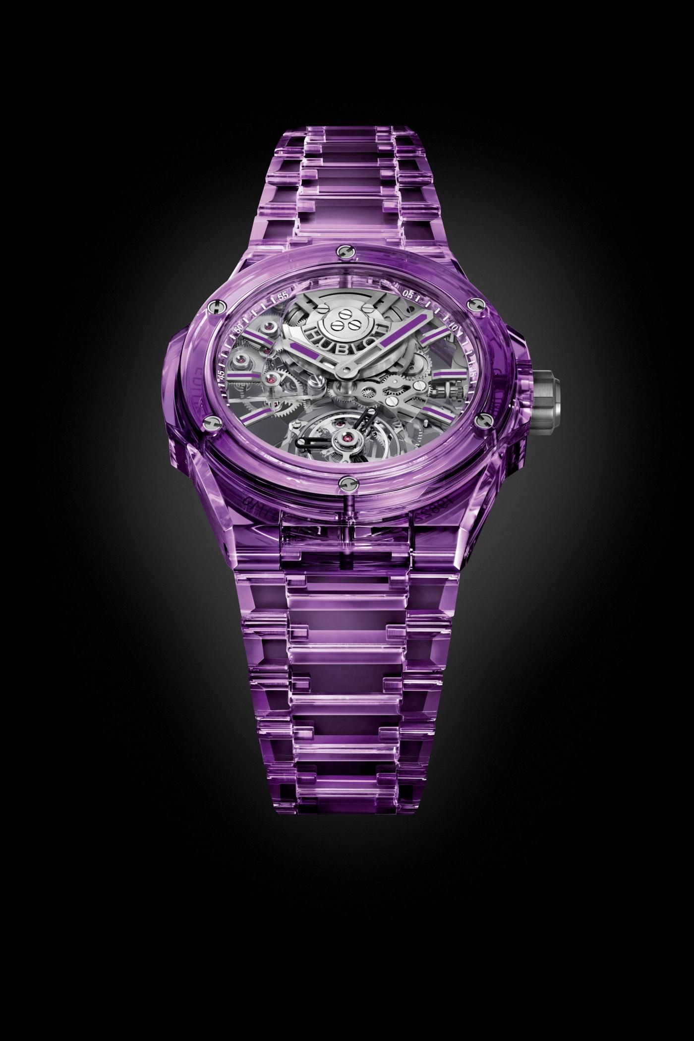 Big Bang Integrated Tourbillon Full Purple Sapphire Big Bang Integrated Tourbillon Full Purple Sapphire 43MM ... • Suggested retail price ((% country %)(% tax %)) Add or remove this watch from your wishlist Add or remove this watch from your wishlist 关注宇舶表微信公众号,了解更多详情 There's a QR code below Inquire A new frontier is reached in the art of sapphire Share Select how you want to share this page. Link to share: An error occurred. Link copied successfully. Big Bang Integrated Tourbillon Full Purple Sapphire ... Add or remove this watch from your wishlist ADD TO WISHLIST REMOVE FROM WISHLIST SHARE Open Nav Go to the top Case Polished Purple Sapphire Crystal Strap Purple Sapphire Crystal Bracelet Water Resistant 30m or 3 ATM Limited Edition 10 See all specs BEHIND THE SCENES OUR CRAFTSMANSHIP Materials Sapphire In search of the perfect fusion between movement and case, Hublot engineers and chemists have researched and developed a transparent material which reveals the heart of the watch, all while being robust enough to effectively protect the mechanism. That’s how the Manufacture has become the expert of synthetic sapphire, a material from which it derives its aesthetic qualities that are unique within watchmaking – transforming each watch into a work of art. Learn more Movements AUTOMATIC TOURBILLON Perfectly illustrating Hublot's watchmaking savoir-faire, this movement designed and produced within the Manufacture is distinguished by its automatic winding system with ball bearings, which offers a convenient 3-day power reserve. The design of the new caliber is equally innovative and features a micro-rotor on the dial side, as well as three sapphire bridges. The unique and highly technical layout emphasizes the spectacular aesthetics of the tourbillon and its contemporary design. Learn more Online and in Boutique exclusive Includes a Hublot complete service. The Hublot Complete Service ensures our select watches continue to move with precision. Learn more technical specifications case reference 455.JM.0120.JM Size 43 mm case Polished Purple Sapphire Crystal bezel Polished Purple Sapphire Crystal water resistance 30m or 3 ATM crystal Sapphire with Anti-reflective Treatment dial Sapphire Crystal Dial movement movement HUB6035 Manufacture Automatic Tourbillon Movement power reserve 72 Hours strap & clasp strap Purple Sapphire Crystal Bracelet clasp Titanium Deployant Buckle Clasp BRACELET ADJUSTMENTFor maximum comfort, we recommend adjusting the bracelet to fit your wrist.You can have this adjustment done in-store.Alternatively, provide us with your wrist size, and we'll adjust it for you. More in Tourbillon Big Bang Integrated Tourbillon Full Carbon 43 mm ... • Suggested retail price ((% country %)(% tax %)) Add or remove this watch from your wishlist Big Bang Integrated Tourbillon Full Blue Sapphire 43 mm ... • Suggested retail price ((% country %)(% tax %)) Add or remove this watch from your wishlist