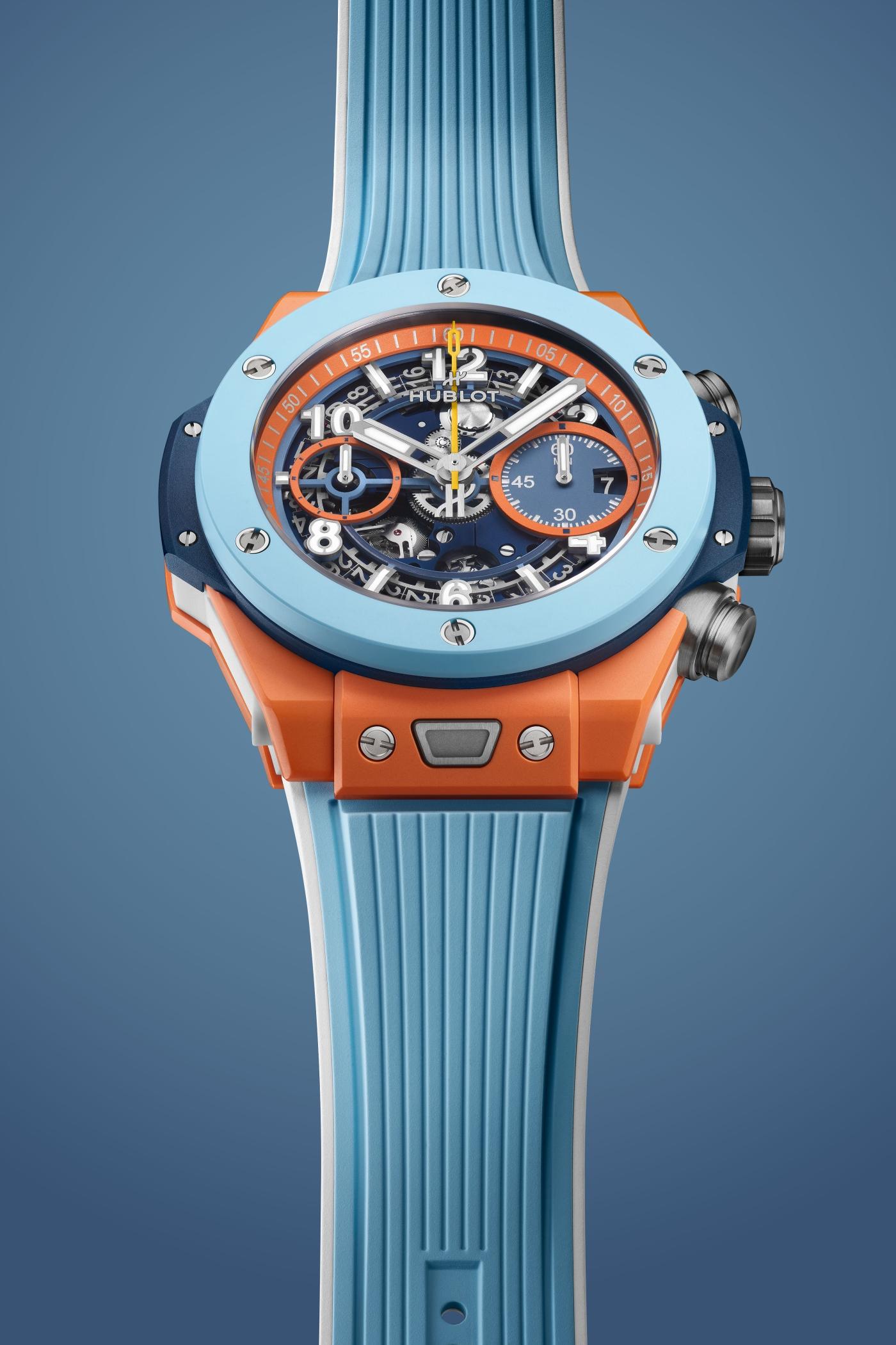 A SPLASH OF INNOVATION Crafted in Hublot’s signature high-tech ceramic, the Big Bang Unico Summer 2025 micro blasted orange case glows like the golden hour, while the sky-blue bezel mirrors the boundless sea. Light, bold and effortlessly cool, it’s made for those who live where the sun meets the waves.